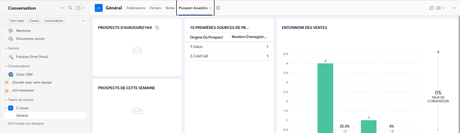 - Dans un canal Teams, vous pouvez afficher un tableau de bord Zoho CRM.
