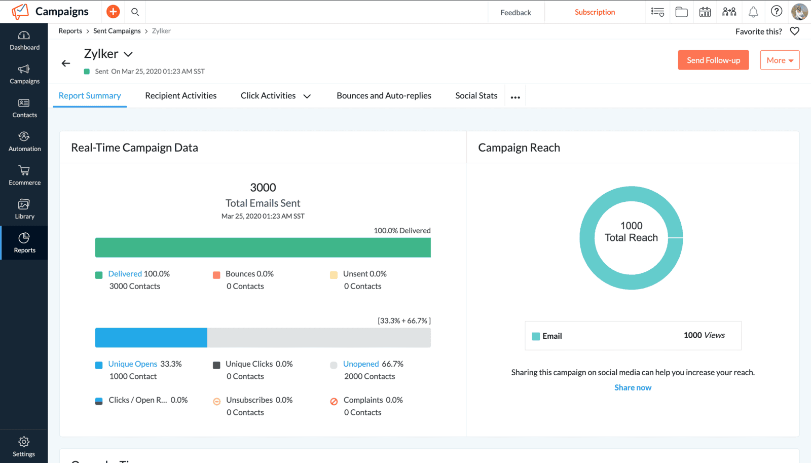 Zoho CRM reste votre référentiel de prospects et de contacts. Zoho Campaigns est alimenté automatiquement et transmet des informations clés à Zoho CRM